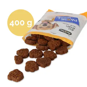 - Skład:Zboża, melasa, mięso i produkty uboczne pochodzenia zwierzęcego (w tym mączka drobiowa i wieprzowa max. 10%), tłuszcze i oleje (tłuszcz drobiowy max. 6%), suszona serwatka, produkty uboczne pochodzenia roślinnego. Dodatki technologiczne: przeciwutleniacze, konserwanty (dodatki WE).