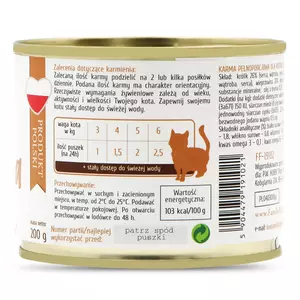 - Skład:jagnięcina 26% (mięso), rosół, kurczak (mięso, wątroba, serca) 20%, wieprzowina 20% (mięso, płuca, wątroba, żołądki, nerki), substancje mineralne, olej z łososia 0,2%, drożdże piwne suszone.
