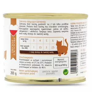 - Skład:dorsz 26% (tuszka), rosół, kurczak 20% (mięso, wątroba, serca), wieprzowina 20% (mięso, płuca, wątroba, żołądki, nerki). substancje mineralne, olej z łososia 0,2%.