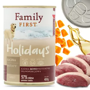Wybierz pożywienie Family First z mięsem kaczki i batatami. To produkt z naturalnym składem, który wspiera psi organizm i jego kondycję.