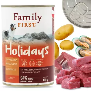 Karma Family First z jagnięciną i wołowiną to doskonały wybór! To zdrowe i pożywne połączenie dwóch rodzajów mięs, cenne dodatki wspierające zdrowie, a przede wszystkim - doskonały smak.