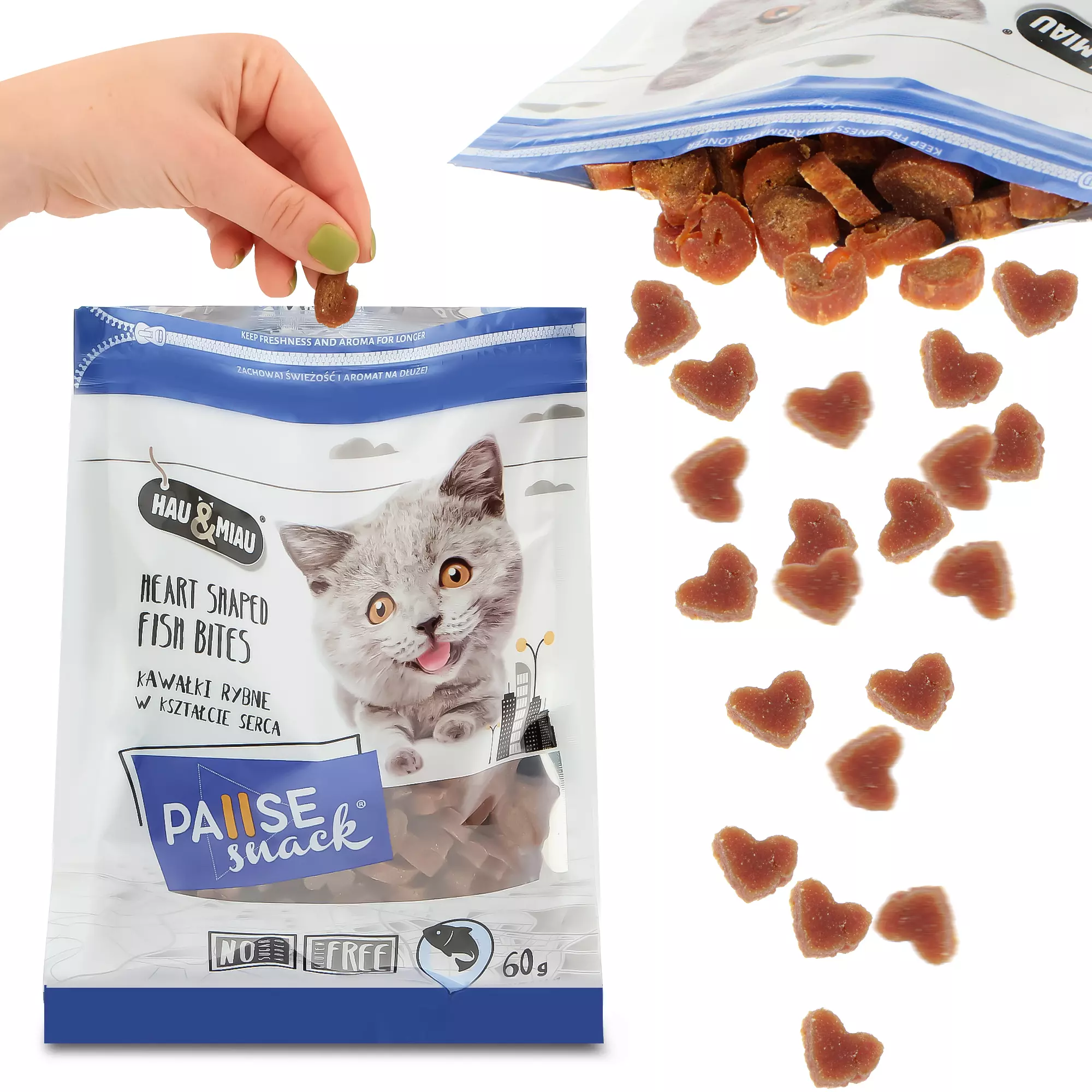 Kawałki ryby w kształcie serca to idealna przekąska dla każdego mruczka. Będzie ona świetnym uzupełnieniem podstawowych posiłków i dostarczy zwierzakowi niezbędnych składników odżywczych. Naturalny skład, który ma aż 75% dorsza jest bogaty m.in. w białko. Składnik ten jest podstawą rozwoju pupila.