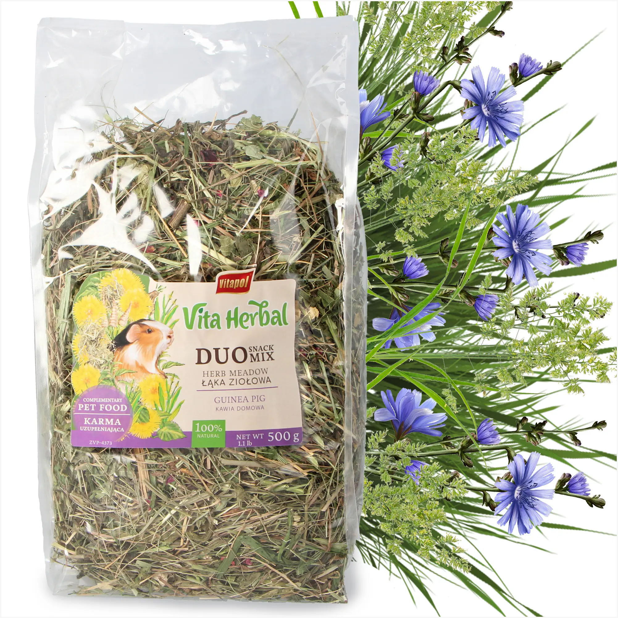 Mieszanka sianka, ziół i warzyw to doskonała propozycja pokarmu uzupełniającego dla świnki morskiej. Składniki pochodzące wprost z natury są cennym źródłem witamin i minerałów. Wypełniają one braki w diecie pupila, dbając o jego dobrą kondycję.