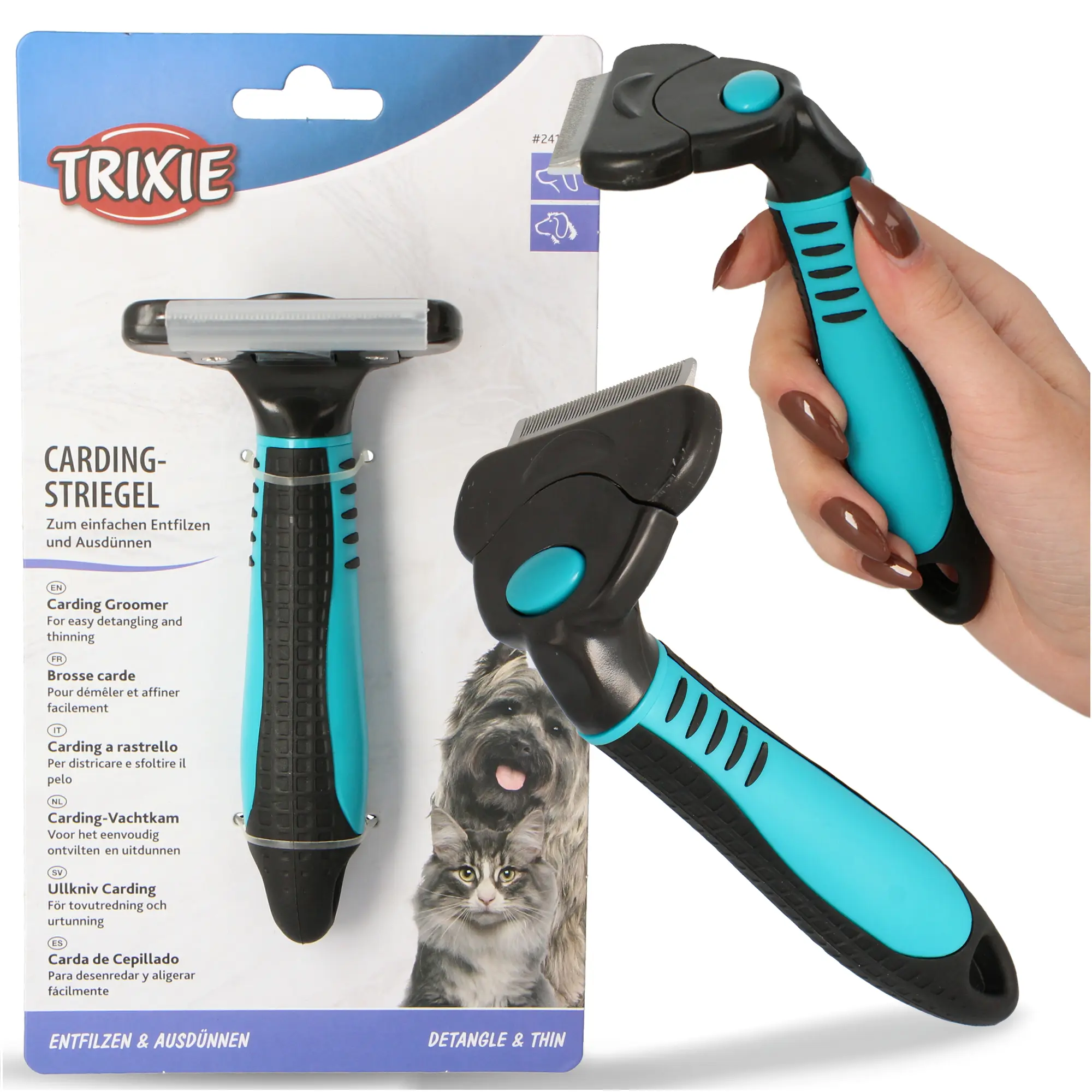 Zgrzebło Carding to akcesorium, dzięki któremu pielęgnacja sierści pupila stanie się przyjemnością. Produkt pozwala szybko i bezproblemowo rozplątać nawet duże kołtuny. Dba nie tylko o wierzchnią warstwę włosów, ale także usuwa splątany podszerstek, zapobiegając linieniu.