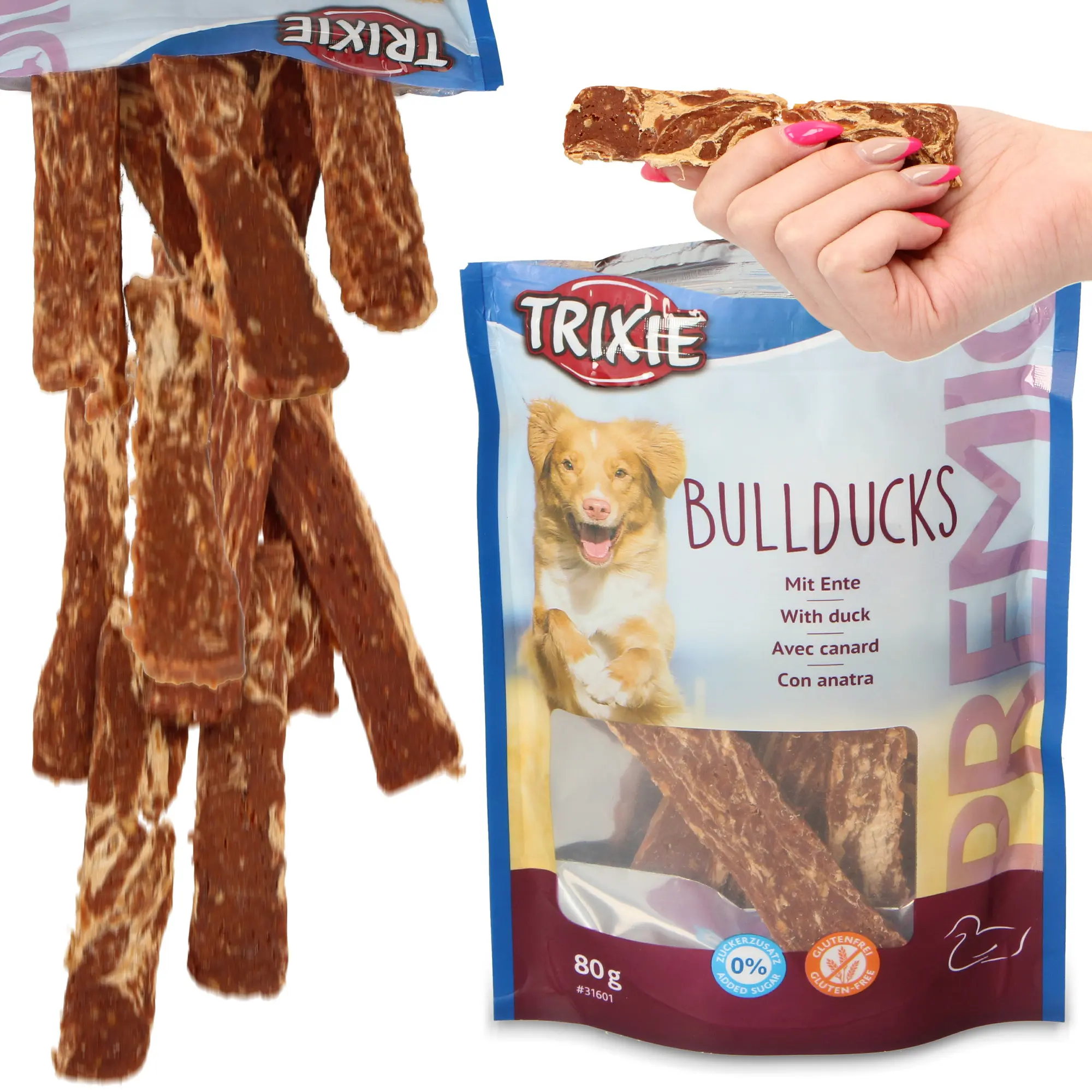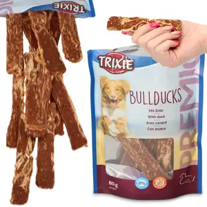 | Skład | Skóra surowa (60%), mięso z kaczki (33%), skrobia grochowa, gliceryna. Bez dodatku cukru. Nie zawiera glutenu. |