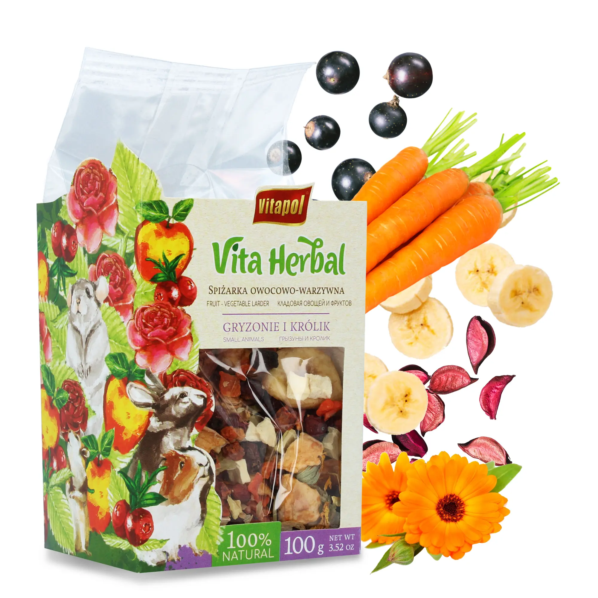 W składzie karmy znajdziesz owoce takie jak jabłko, banan, jarzębina, głóg, a także warzywa - marchew, pasternak, por, ziemniak. Całość została wzbogacona dodatkiem kwiatów - bławatka, nagietka, róży. Ważnym składnikiem są także szyszki chmielowe.