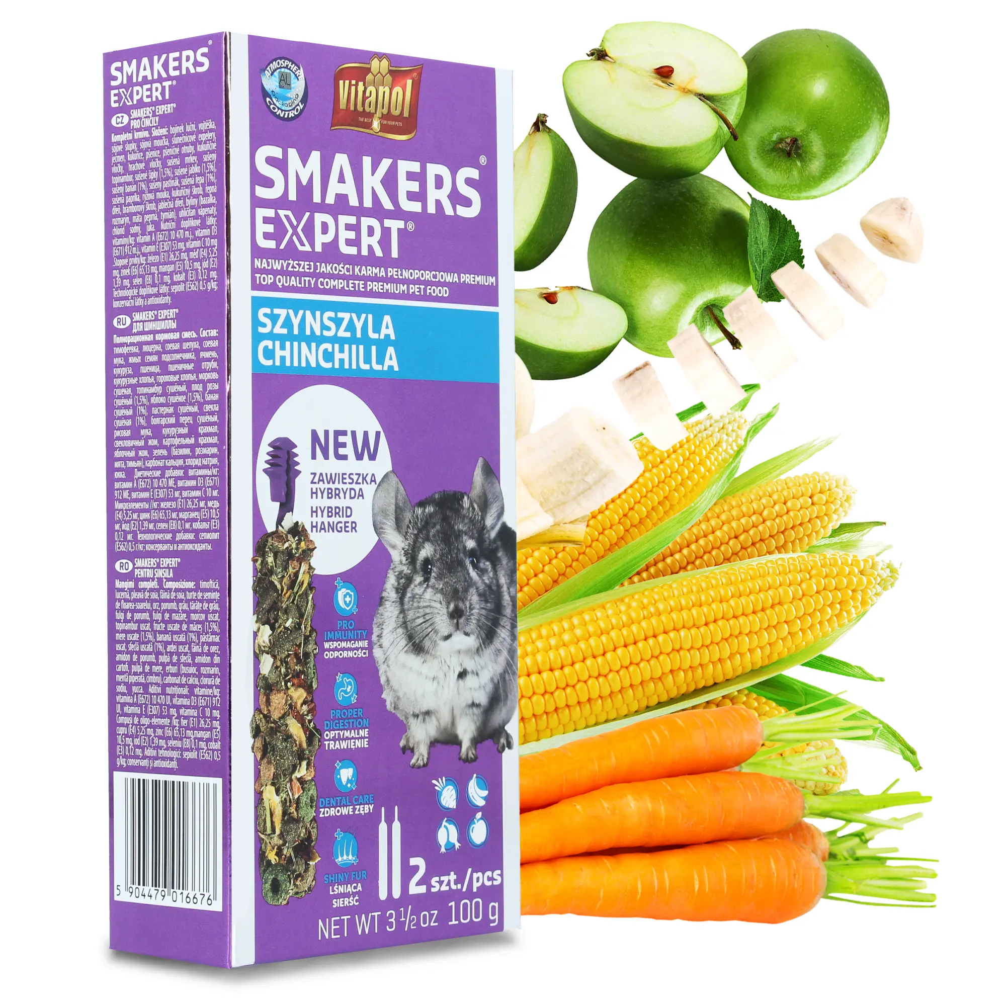 | Skład | Tymotka, lucerna, łuski sojowe, mączka sojowa, makuch z nasion słonecznika, jęczmień, kukurydza, pszenica, otręby pszenne, płatki kukurydzy, płatki grochowe, marchew suszona, topinambur suszony, owoc róży suszony, jabłko suszone, banan suszony, pasternak suszony, burak suszony, papryka suszona, mąka ryżowa, skrobia kukurydziana, pulpa buraczana, skrobia ziemniaczana, pulpa jabłkowa, zioła (bazylia, rozmaryn, mięta pieprzowa, tymianek), węglan wapnia, chlorek sodu, juka. |