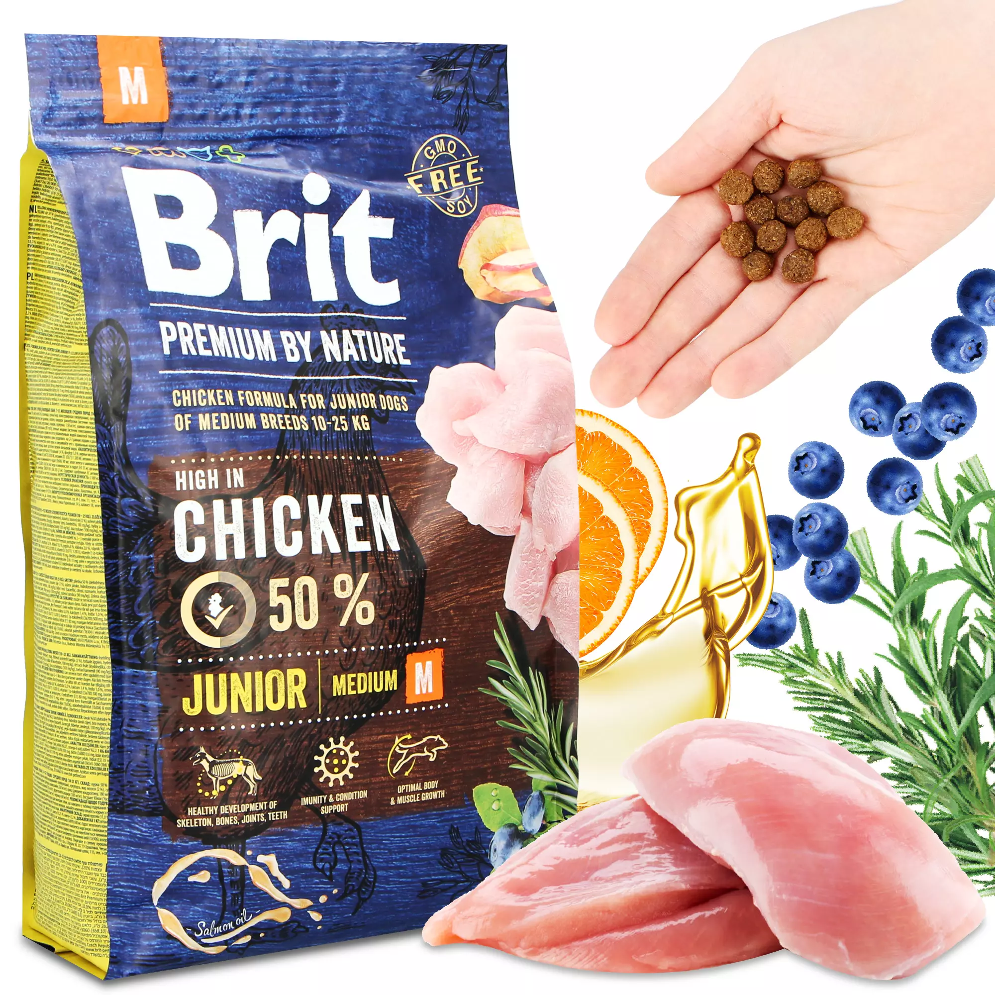 | Skład | kurczak 50% (dehydratyzowany 30%, odkostniony 20%), owies zwyczajny, pszenica, tłuszcz z kurczaka (konserwowany mieszanką tokoferoli), kukurydza, olej z łososia (2%), suszone jabłka, hydrolizowana wątróbka drobiowa, drożdże browarniane, kolagen, hydrolizat muszli skorupiaków (źródło glukozaminy, 260 mg/kg), wyciąg z chrząstki (źródło chondroityny, 180 mg/kg), wyciąg z ziół i owoców (goździki, owoce cytrusowe, rozmaryn, kurkuma, 150 mg/kg), mannooligosacharydy (150 mg/kg), fruktooligosacharydy (100 mg/kg), jukka Mojave (100 mg/kg), suszony rumianek (90 mg/kg), małże zielonowargowe (źródło glukozaminoglikanów, 60mg / kg), suszone borówki (60mg/kg) |