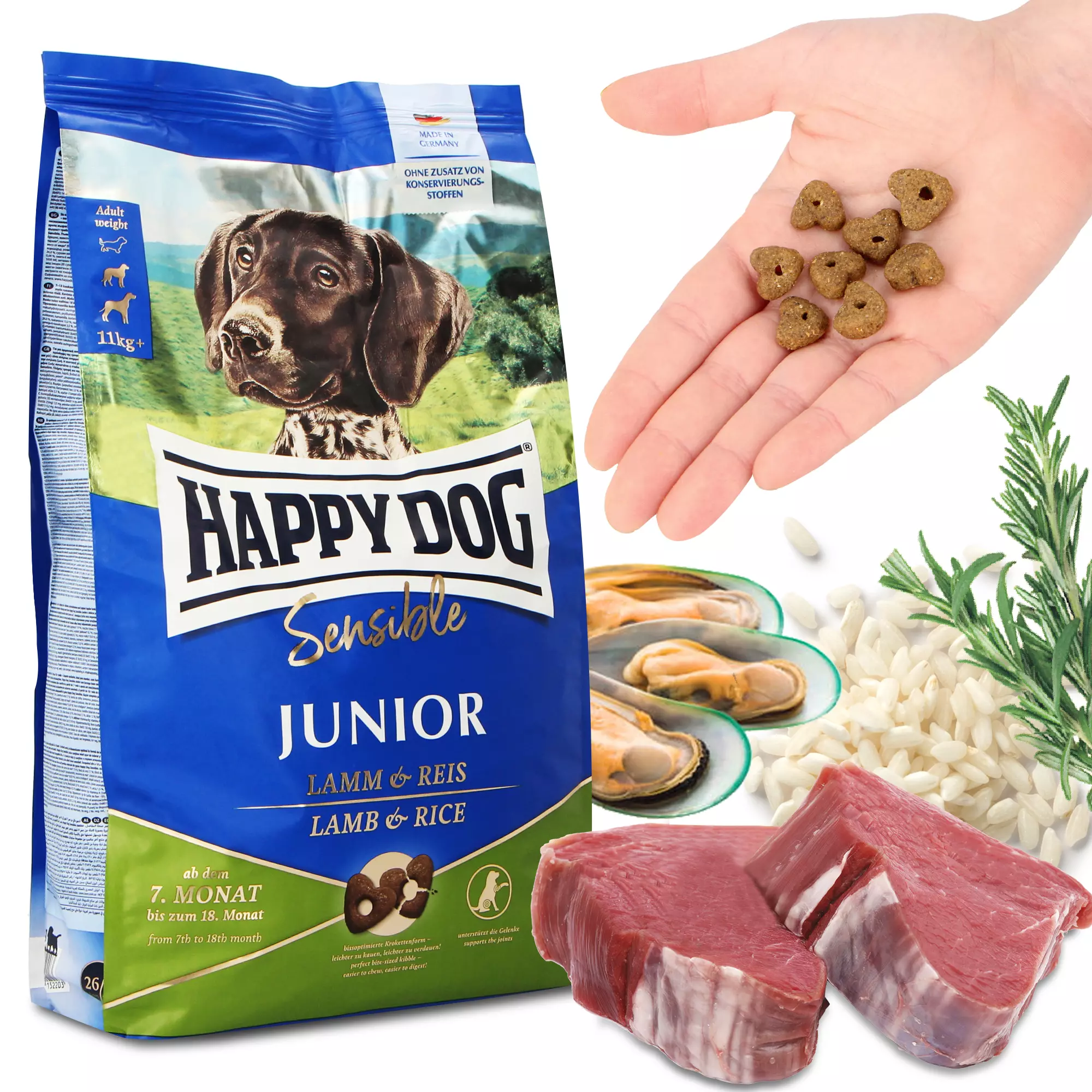 | Skład | białko jagnięce* (19%), mączka ryżowa (17%), mąka kukurydziana, skwarki, tłuszcz wołowy, hydrolizat wątroby, olej słonecznikowy, melasa buraczana* (bez cukru), wytłoki jabłkowe* (0,7%), chlorek potasu, olej rzepakowy, drożdże*, chlorek sodu, algi morskie, siemię lniane (0,16%), łupiny babki jajowatej (0,1%), mięso małży* (0,05%), juka schidigera*, drożdże (wyciąg), ostropest plamisty, karczoch, mniszek, imbir, liście brzozy, pokrzywa, rumianek, kolendra, rozmaryn,szałwia, korzeń lukrecji, tymianek, (zioła suszone razem 0,16%);*) suszona/y/e. |