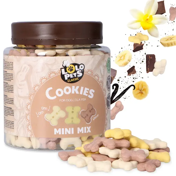 Bardzo smaczna mieszanka przekąsek - ciasteczka mają zachęcający smak i psiaki chętnie je zjadają.
