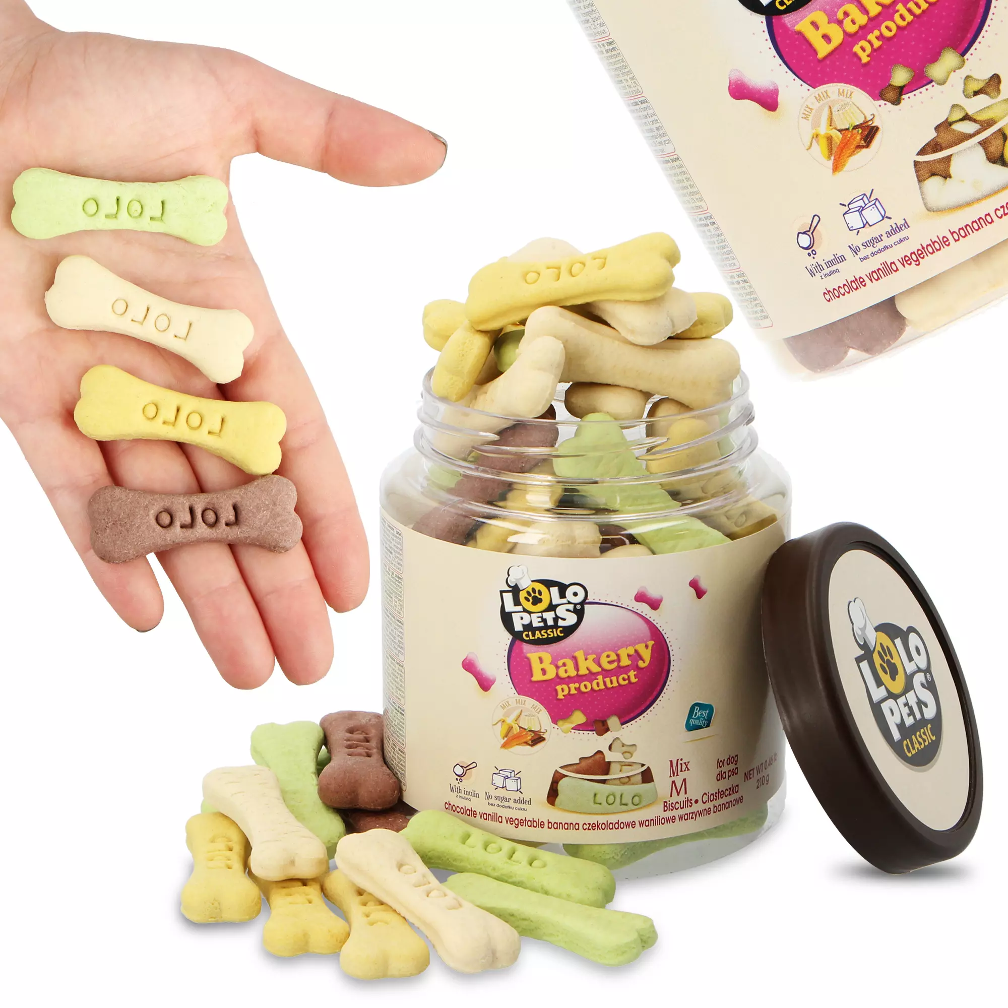 Bardzo smaczna mieszanka przekąsek - ciasteczka mają zachęcający smak i psiaki chętnie je zjadają.